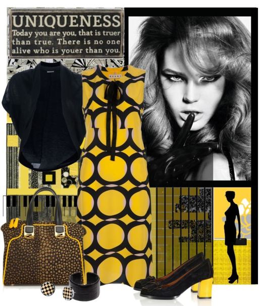 Yellow silk sleeveless dress from Marni featuring a black circle graphic print, a round neck, a small keyhole opening with a black ribbon fastening to the top, a seam detail to the waist and an A-line skirt